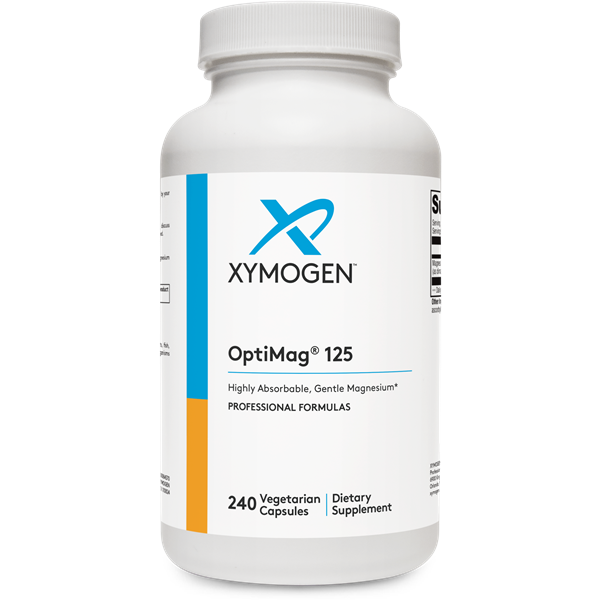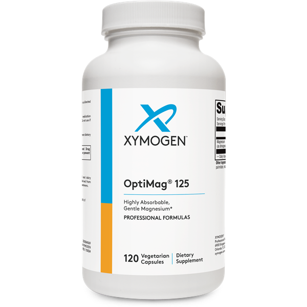 Magnesium, the fourth most abundant mineral in the human body, plays a role in over 300 metabolic processes. It participates in the development and maintenance of bones and teeth; the metabolism of carbohydrates, blood glucose, fats, and proteins; the formation of cells and tissues; and the maintenance of muscle function, including cardiac muscle. OptiMag® 125 contains Albion®’s TRAACS® magnesium lysinate glycinate (mineral amino acid chelate) and Albion’s chelated dimagnesium malate—both formulated for enhanced absorption. Malic acid (from di-magnesium malate) supports energy production and lactic acid clearance via the Krebs cycle. Malic acid may also support antioxidant systems by enhancing glutathione and antioxidant enzymes.*
