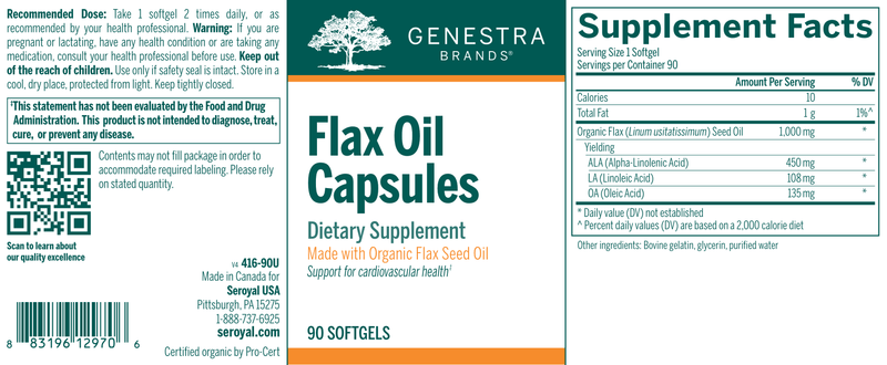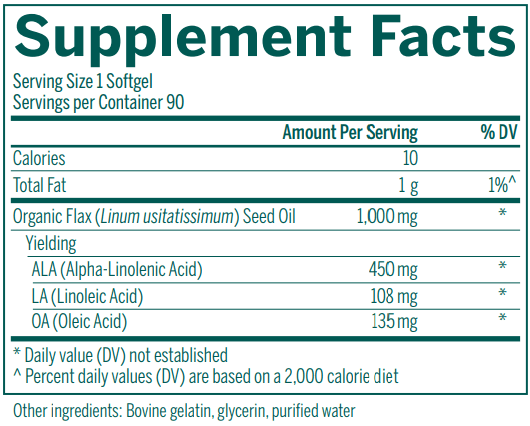 Flax is a plant source of the omega-3 fatty acid alpha linolenic acid (ALA) and the omega-6 fatty acid linolenic acid (LA). ALA is metabolized to EPA and DHA. Recent research suggests that daily supplementation with flaxseed oil for eight weeks supports healthy levels of EPA and DPA, a DHA precursor and likely storage form of EPA. Fatty acids promote cardiovascular health and support optimal skin health and hydration. ALA may help to maintain platelet and endothelial cell function.