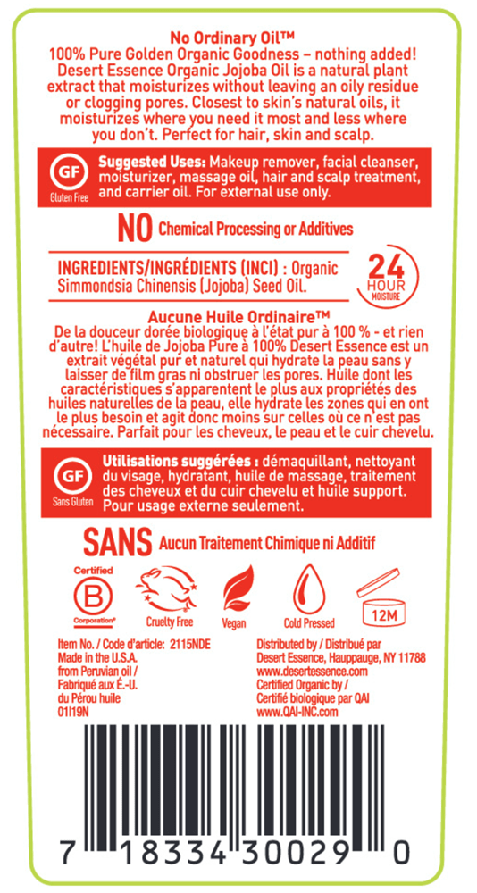 100% Pure Golden Organic Goodness - nothing added! Desert Essence Organic Jojoba Oil is a natural plant extract that moisturizes without leaving an oily residue or clogging pores. Closest to skin's natural oils, it moisturizes where you need it most and less where you don't. Perfect for hair, skin, and scalp.