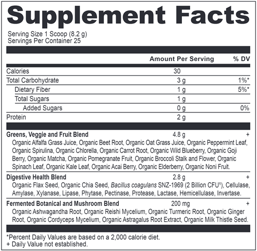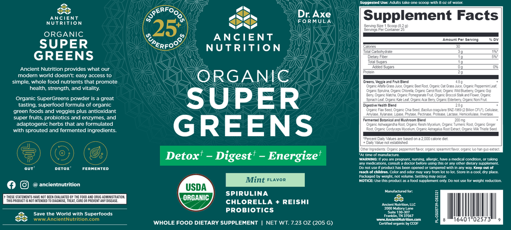 It can seem almost impossible to get enough vegetables and superfoods in your diet. That’s one of the reasons Ancient Nutrition created Organic SuperGreens. It brings the benefits of juicing, but in an easy-to-mix, powder form. Rather than needing an expensive juicer and pounds of vegetables and fruits, you can enjoy a single scoop of this delicious powder instead.