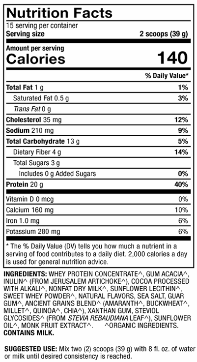 Each serving offers a superfood blend of 20 grams of protein, 1.5 grams of immunoglobulin G (IgG), amino acids, conjugated linoleic acid (CLA) and organic sunflower lecithin.