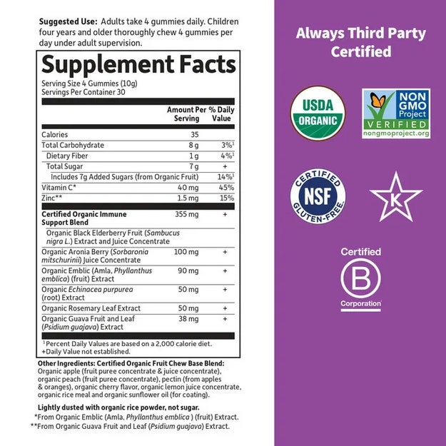 Made with Certified Organic and Non-GMO Project Verified real fruit, our Elderberry Gummy contains no gelatin and no refined sugar. Black Elderberry and Echinacea—also included—have been used for centuries across Europe and North America in traditional herbal remedies. We’ve also added zinc and vitamin C for an added boost to our Elderberry Gummy.