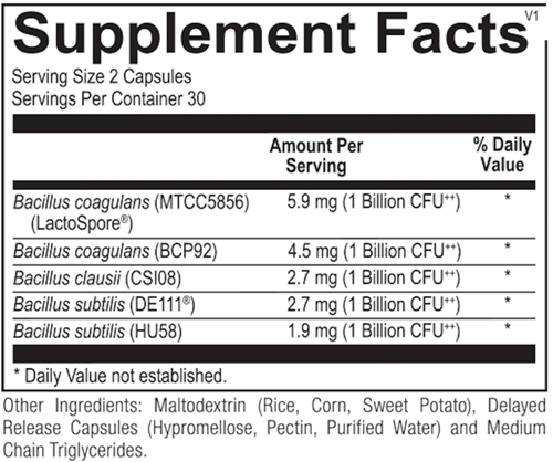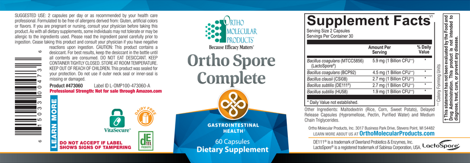 Ortho Spore Complete is a unique spore-based, broadspectrum probiotic formula designed to promote a healthy gut microbiota, support gastrointestinal (GI) health, and support immune function. Ortho Spore Complete is specifically formulated with several spore-based probiotic strains to promote diversity and balance within the host