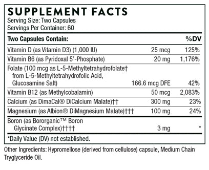 Adequate magnesium intake promotes bone density by optimizing the secretion of parathyroid hormone and facilitating active calcium transport to the bones.* Advanced Bone Support provides vitamin D3, which facilitates the absorption of calcium; boron, which assists the body's metabolism of vitamin D and estrogen; and B vitamins for healthy methylation, which mediates homocysteine levels, a known risk factor of low bone density.*