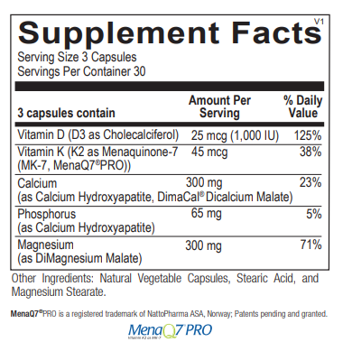 Vitamin D (as D3): Vitamin D is essential for the efficient utilization of calcium by the body. Vitamin D normalizes serum calcium by increasing the intestinal absorption of dietary calcium, increasing the reabsorption of calcium filtered by the kidneys, and mobilizing calcium from bone when there is insufficient dietary calcium to maintain normal serum calcium concentrations. Vitamin K and vitamin D share similar qualities, and act in synergy within the body to maintain calcium balance and proper distribution. A randomized study that split 172 women into a vitamin K2 group, a vitamin D3 group, a vitamin K2 and D3 group, and a placebo group for two years found that the combination of vitamin D3 and K2 had the most benefits for supporting bone health among the groups. This formulation includes 45 mcg of vitamin K2 and 1,000 IU of vitamin D3 per capsule for optimal absorption and use by the body.