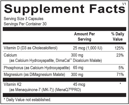 Vitamin D (as D3): Vitamin D is essential for the efficient utilization of calcium by the body. Vitamin D normalizes serum calcium by increasing the intestinal absorption of dietary calcium, increasing the reabsorption of calcium filtered by the kidneys, and mobilizing calcium from bone when there is insufficient dietary calcium to maintain normal serum calcium concentrations. Vitamin K and vitamin D share similar qualities, and act in synergy within the body to maintain calcium balance and proper distribution. A randomized study that split 172 women into a vitamin K2 group, a vitamin D3 group, a vitamin K2 and D3 group, and a placebo group for two years found that the combination of vitamin D3 and K2 had the most benefits for supporting bone health among the groups. This formulation includes 45 mcg of vitamin K2 and 1,000 IU of vitamin D3 per capsule for optimal absorption and use by the body.