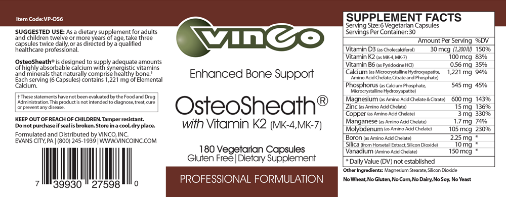 Vinco’s OsteoSheath® is made up of bioavailable Calcium (Microcrystalline Hydroxyapatite or MCHC, Amino Acid Chelate, Citrate, and Phosphate), and is combined with other complementary ingredients to provide healthy bone density management.*