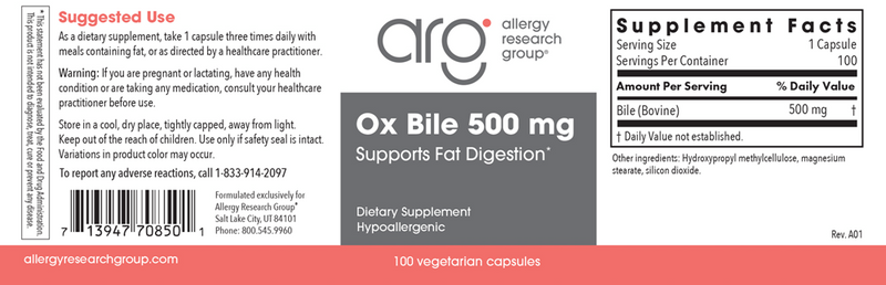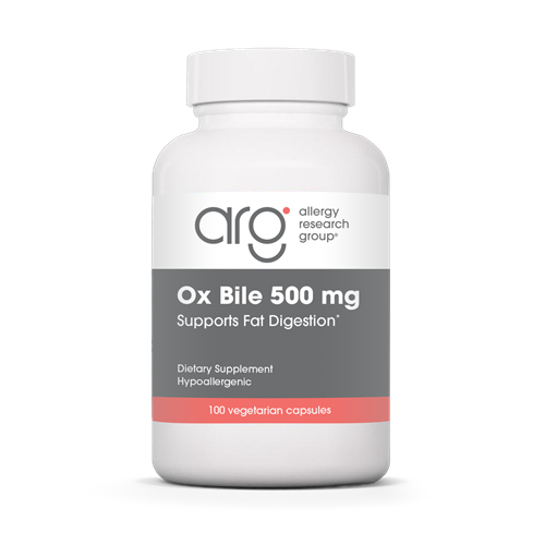 Ox Bile provides bile salts to support the digestion and absorption of dietary fats and fat-soluble vitamins (A, D, E, and K).* It complements the body’s own bile production and may be especially helpful to support healthy motility and upper digestive support.* ARG offers Ox Bile in 500 mg and 125 mg strengths.