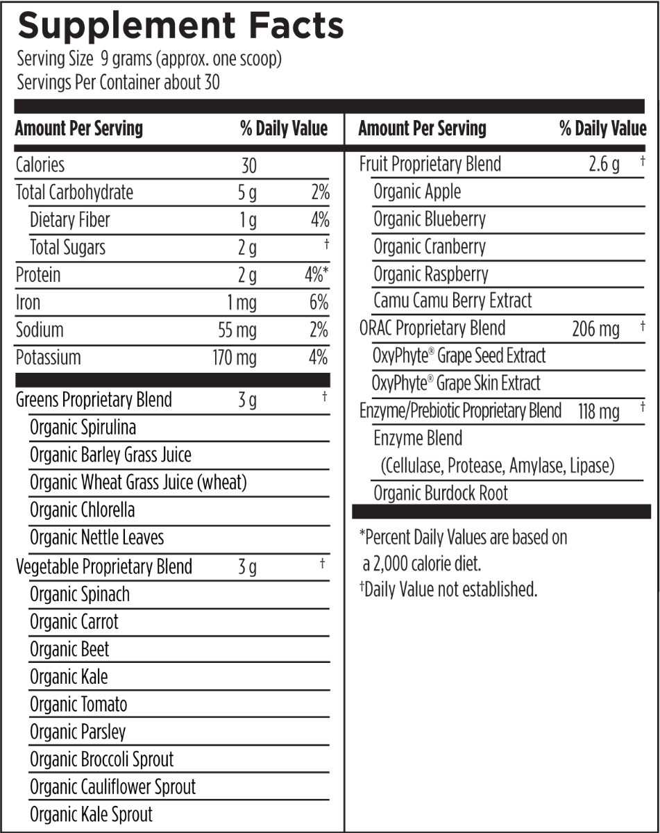These greens have a Paleo profile; they contain no grains, legumes, alfalfa, gluten, fructose, or artificial sweeteners. Unlike other greens products, we never add inexpensive fillers or bulking agents such as fiber, whole grasses, pectin, rice bran, and/or flax, which account for 40% to 60% of the content of most other greens products. We work closely with our certified organic growers to ensure the optimal preservation of enzymes and beneficial phytonutrients in every ingredient. These ingredients are harvested at their peak of potency and are immediately concentrated and dried utilizing proprietary cool-temperature processes that preserve their energetic and nutritional integrity.