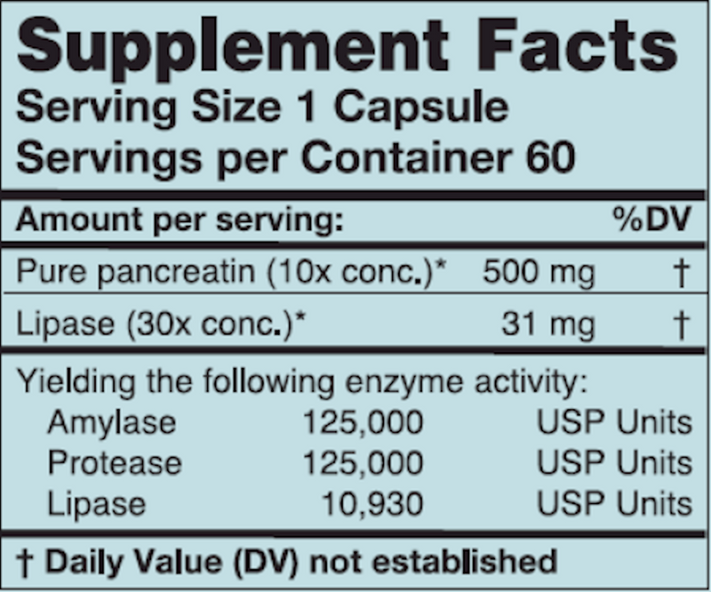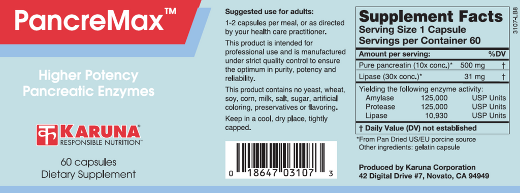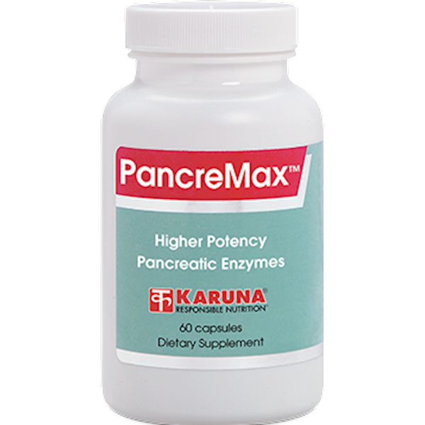 PancreMax provides a strong 10X concentration of pancreatic amylase, protease and lipase enzymes from freeze-dried porcine source, for reliable support of the intestinal phase of digestion. Adequate protease activity ensures thorough breakdown of food proteins for optimal amino acid absorption and for avoiding inappropriate absorption of food antigens. High lipase activity supports absorption of essential fatty acids and fat-soluble vitamins, and helps prevent complaints associated with eating high-fat meals.*