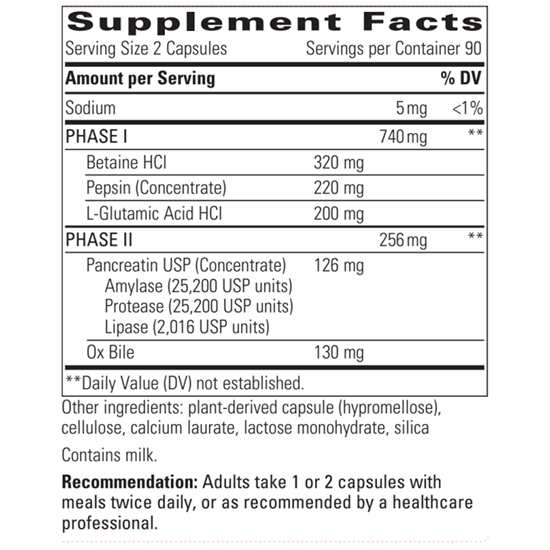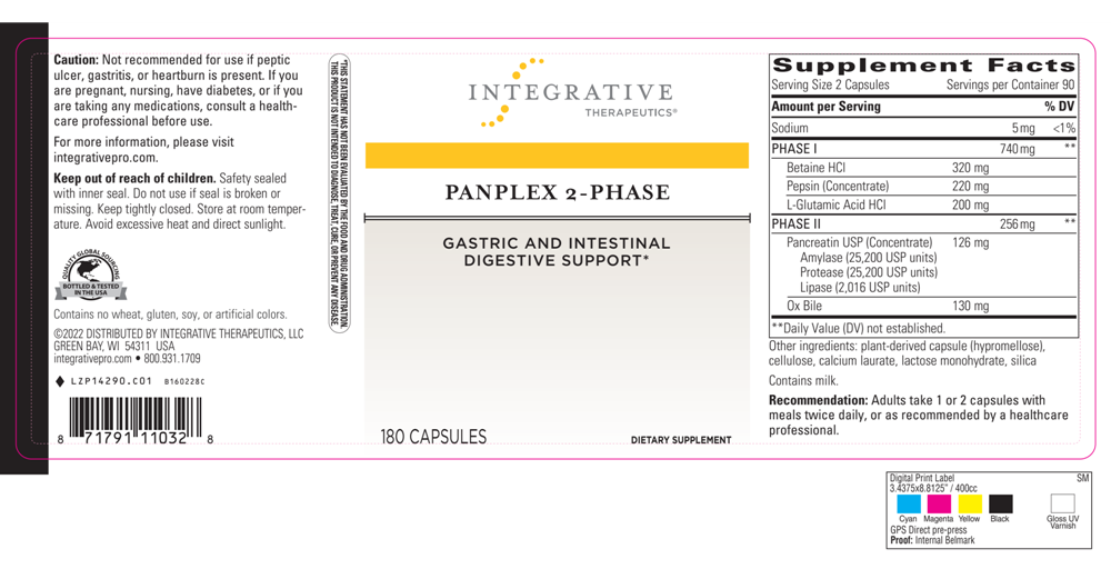 Panplex 2-Phase combines pancreatic enzymes with hydrochloric acid and pepsin for healthy digestion support.* Phase I gastric support includes hydrochloric acid and pepsin.* Phase II intestinal support includes pancreatin and bile salts which helps protect against deactivation of enzymes by stomach acids.*