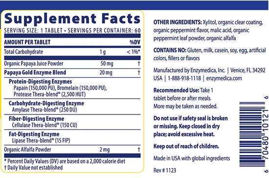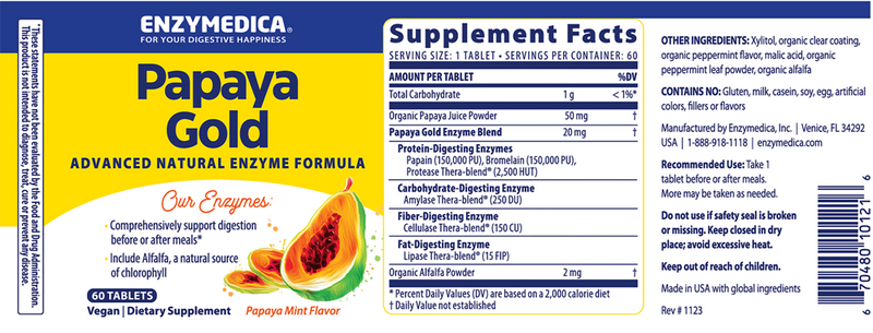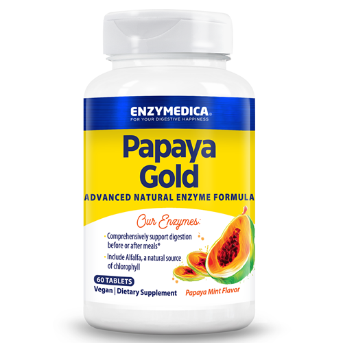 Papaya Gold is an advanced enzyme formula that helps you enjoy the benefits of papaya and other high-potency enzymes in a single, non-chalky and delicious chewable tablet. With a comprehensive and clean blend that works throughout the broad pH ranges of the body, you'll feel a difference at your next meal.
