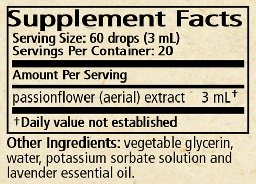 Ingredients: Passionflower in a base of vegetable glycerin, mountain spring water and lavender essential oil with potassium sorbate solution 0.1%.