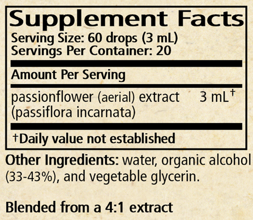 Ingredients: Organic Passionflower flowering tips, 1:1 fresh + dry, in a base of organic cane alcohol, spring water and vegetable glycerin.