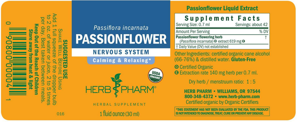 Herb Pharm prepares Passionflower extract from the flowering herb (leaf, flower & succulent stem) of Certified Organic Passiflora incarnata vines.