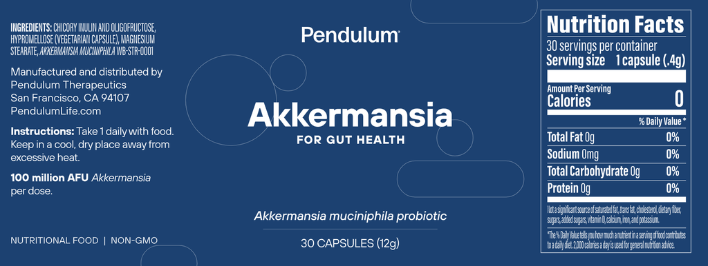 Pendulum Akkermansia contains the strain Akkermansia muciniphila, the prebiotic inulin and is on-GMO verified, vegan, gluten-free, sourced & manufactured in the USA.