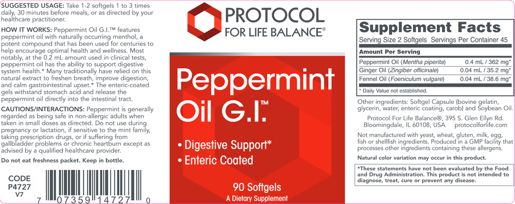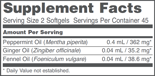 Peppermint Oil G.I.™ features peppermint oil with naturally occurring menthol, a potent compound that has been used for centuries to help encourage optimal health and wellness. Most notably, at the 0.2 mL amount used in clinical tests, peppermint oil has the ability to support digestive system health.* Many traditionally have relied on this natural extract to freshen breath, improve digestion, and calm gastrointestinal upset.* The enteric-coated gels withstand stomach acid and release the peppermint oil directly into the intestinal tract.
