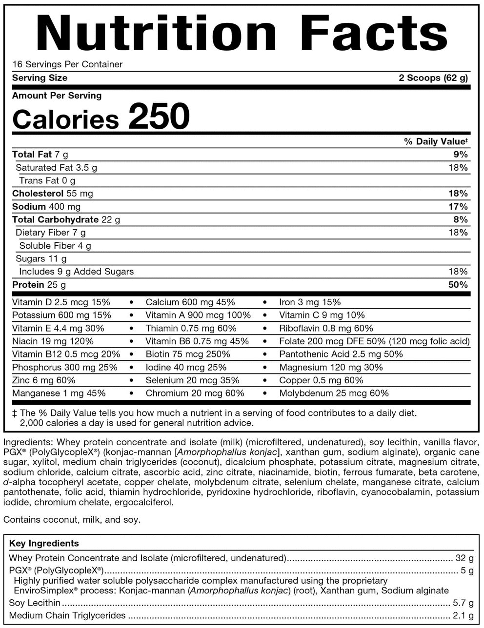 PGX is combined with whey protein and medium chain triglycerides, shown clinically to enhance body fat loss while preserving lean muscle, and to induce satiety and a decreased consumption of calories, respectively. A full complement of vitamins and minerals ensure support for healthy macronutrient metabolism.