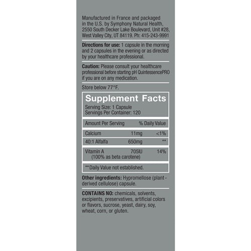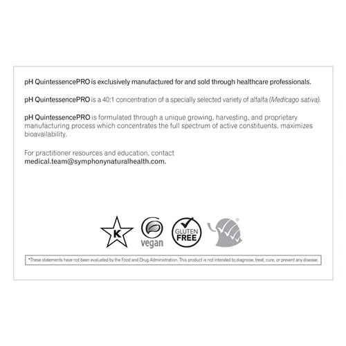 pH QuintessencePRO is a 40:1 concentrated preparation of a specially selected variety of alfalfa (Medicago sativa) from the more than 70 varieties that exist. pH QuintessencePRO is formulated through a unique growing, harvesting, and proprietary manufacturing process which concentrates the full spectrum of active constituents, maximizes bioavailability, and contains no grass allergens or phytoestrogens.