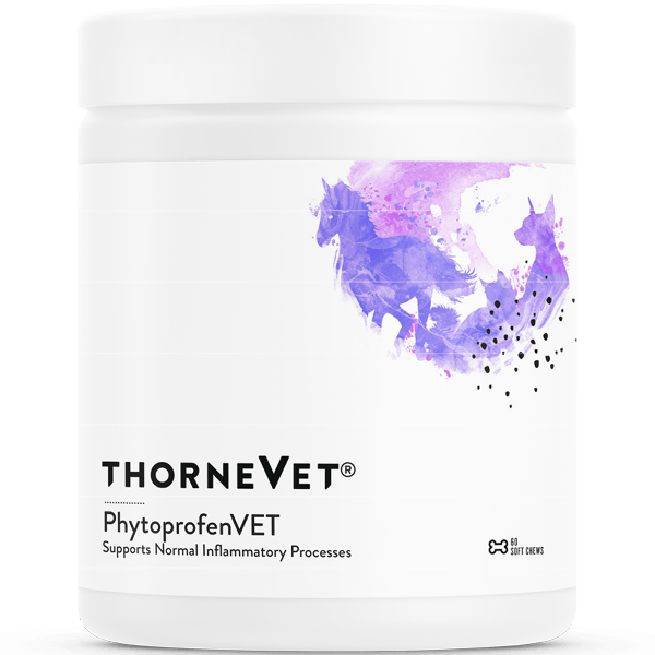 PhytoprofenVET is a unique blend of botanical extracts, curcumin, Boswellia, and ginger, combined with bromelain to help minimize post-injury bruising and swelling and support post-surgery healing. PhytoprofenVET is an exclusive ThorneVET formula that combines several botanicals, including a synergistic blend of the Ayurvedic herbs – ginger, Boswellia, and curcumin (that is bound to phospholipids for enhanced absorption – CurcuVET®) – all of which help maintain a healthy balance of cytokines. Cytokines are cell-signaling molecules that aid cell-to-cell communication in immune responses and stimulate the movement of cells. PhytoprofenVET can be used for cats, dogs, and horses.