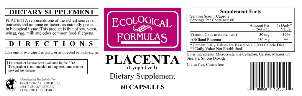 Placenta 250 mg by Ecological Formulas is a dietary supplement designed to support the healthy functioning of the immune system response.* Placenta 250 mg by Ecological Formulas features the highest quality lypholized, or freeze-dried, placenta sourced from the tissues of organically raised New Zealand bovine, considered one of the richest resources of nutrients and immune co-factors.*