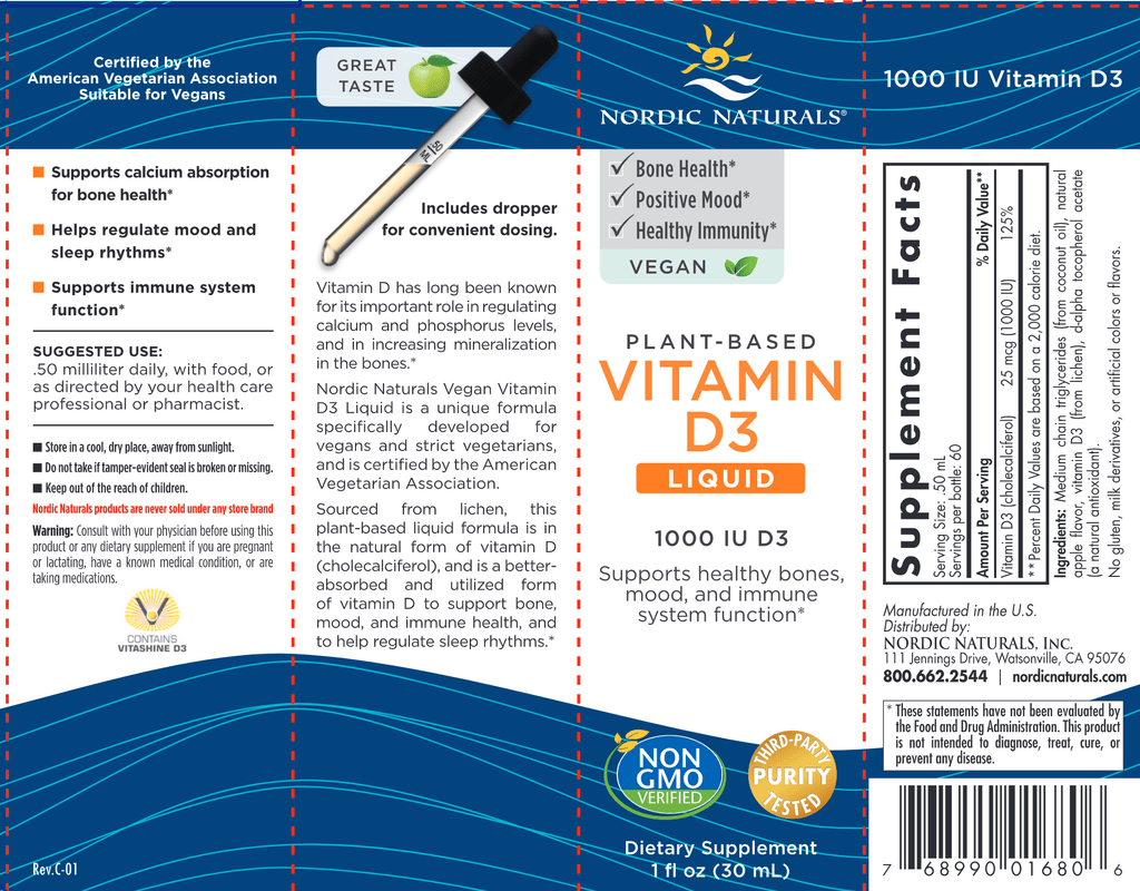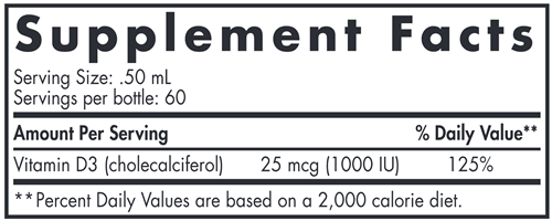 Plant-Based Vitamin D3 Liquid is a unique formula developed specifically for vegans, vegetarians, and those who prefer a form of vitamin D3 that isn't derived from lanolin or fish oil. This plant-based liquid formula provides 25 mcg (1000 IU) of vitamin D3 (cholecalciferol), the same form the body makes from sunlight and the form it absorbs best.* One dose provides the daily recommended amount of vitamin D.