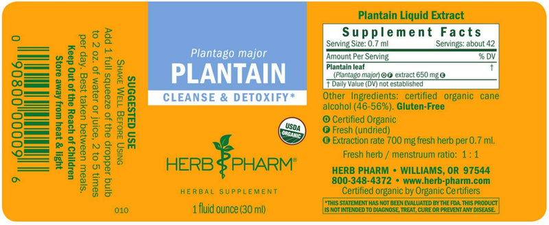 Herb Pharm prepares Plantain extract from fresh (never dried) leaf of Plantago major plants grown on Certified Organic farms in southern Oregon. We harvest the leaves early each spring, then extract them fresh.