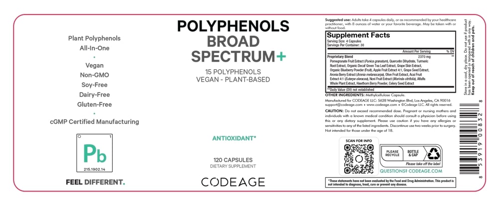Codeage Polyphenols Broad Spectrum offers a high-quality blend of 16 different berries, fruits, and botanical extracts to offer a vegan all-in-one polyphenols solution. This polyphenol formula features organic and decaf green tea leaf extract. Green tea is a well-known source of polyphenols and can conveniently be consumed in a green tea pill format.These polyphenols and quercetin pills feature 16 different polyphenols to help provide a source of resveratrol. The solution can also offer a source of flavonoids and phenolic compounds.