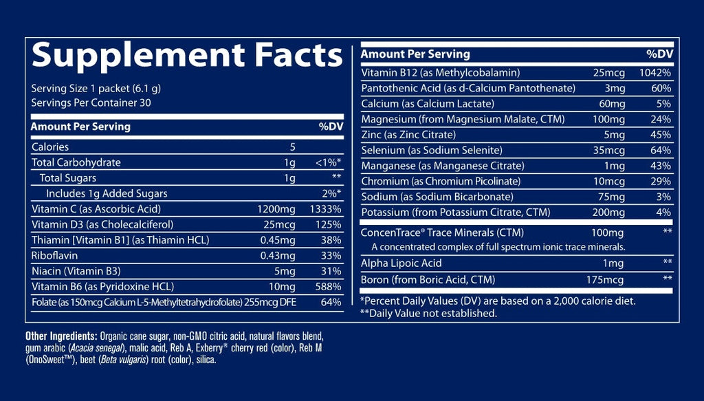 Their formula is Non-GMO and contains 1200 mg of Vitamin C, an essential antioxidant for people who are active and on the go.* It also contains all major electrolytes (potassium, magnesium, chloride and sodium), plus over 72 verified ionic minerals and trace minerals from ConcenTrace®, which supports the assimilation and absorption of vitamins and nutrients.*