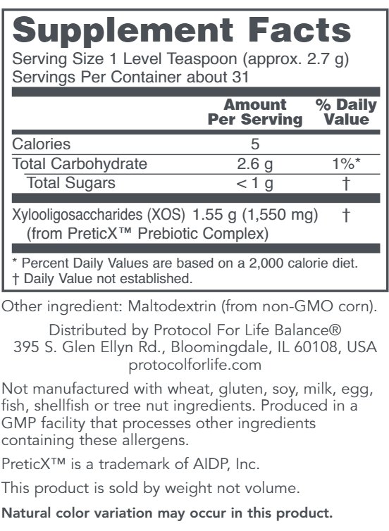 Prebiotic Powder XOS features PreticX™, a prebiotic complex comprised of xylooligosaccharides (XOS). XOS are selective, bifidogenic prebiotics shown to increase the amount of healthful Bifidobacteria in the GI tract of healthy individuals, which is particularly beneficial with aging.* When added to the diet, Prebiotic Powder XOS helps to maintain healthy flora balance, nourishes the intestinal lining, and promotes regularity without additional bloating or flatulence.* Consider adding this product to your probiotic supplements. PreticX™ is a trademark of AIDP, Inc. This product is sold by weight not volume.