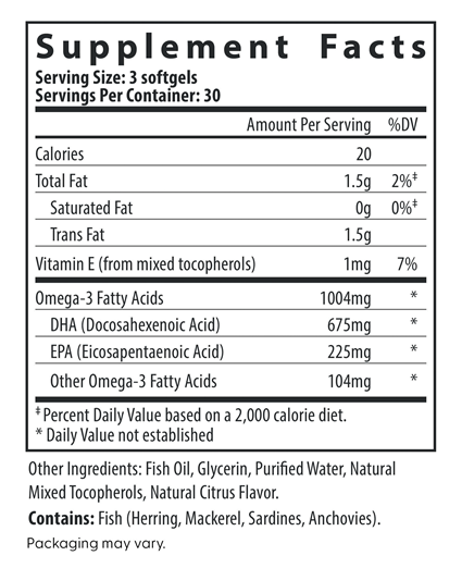 A pharmaceutical-grade fish oil supplement that provides the omega-3 fats needed to support fertility and pregnancy wellness. Made from small, cold water fish – processed to remove heavy metals. Provides 675 mg of DHA and 225 mg of EPA per daily dose. Small, easy to swallow softgels with a natural citrus flavor.