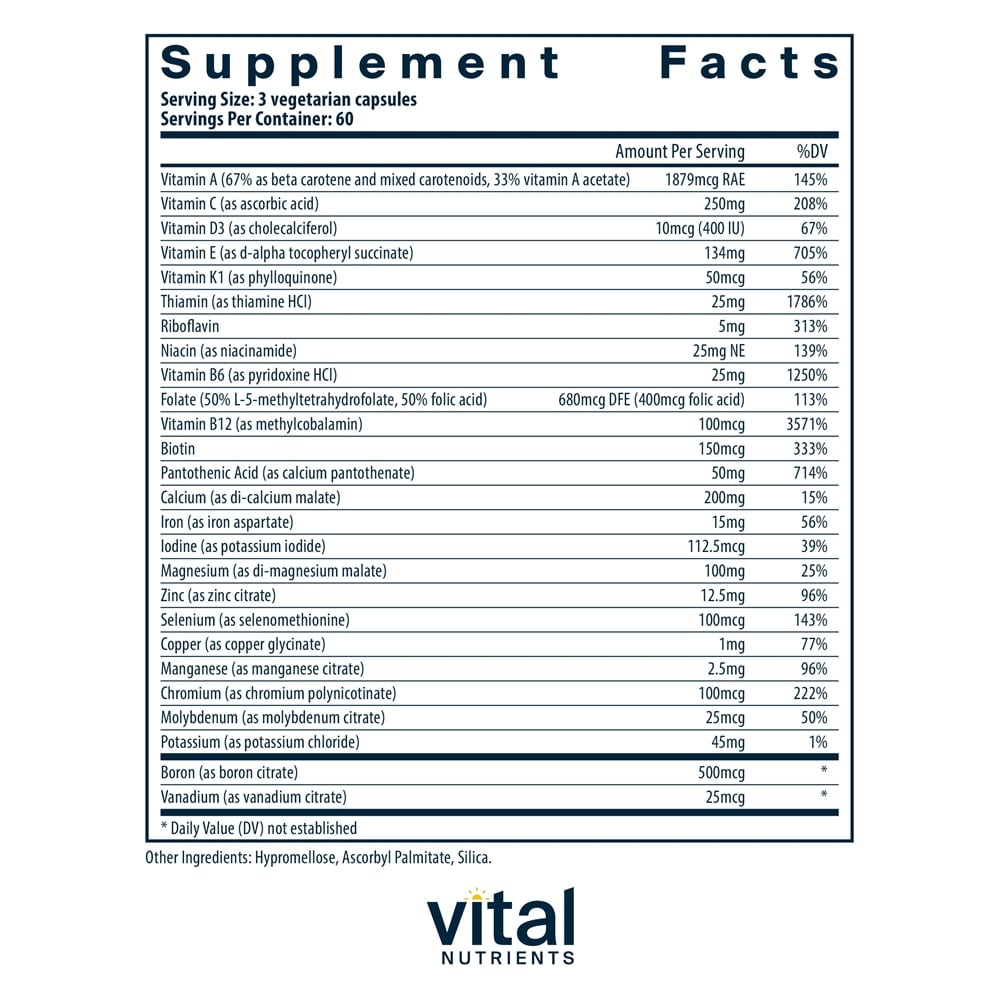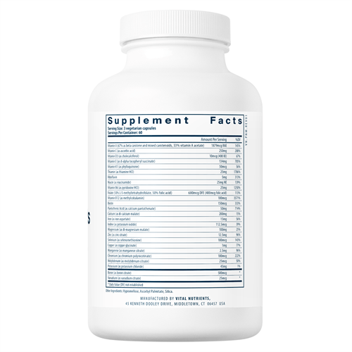 PreNatal Multi-Nutrients is a high potency multi-vitamin/mineral and trace element formula that was specially formulated to support women's health during pregnancy and lactation.* It provides the highest nutritional value for all systems of the body, including potent antioxidants, highly absorbable iron aspartate, and a therapeutic dose of Folate as Metafolin L-5-MTHF.* It is a bioavailable formula that is gentle on the stomach and well tolerated by most individuals.*