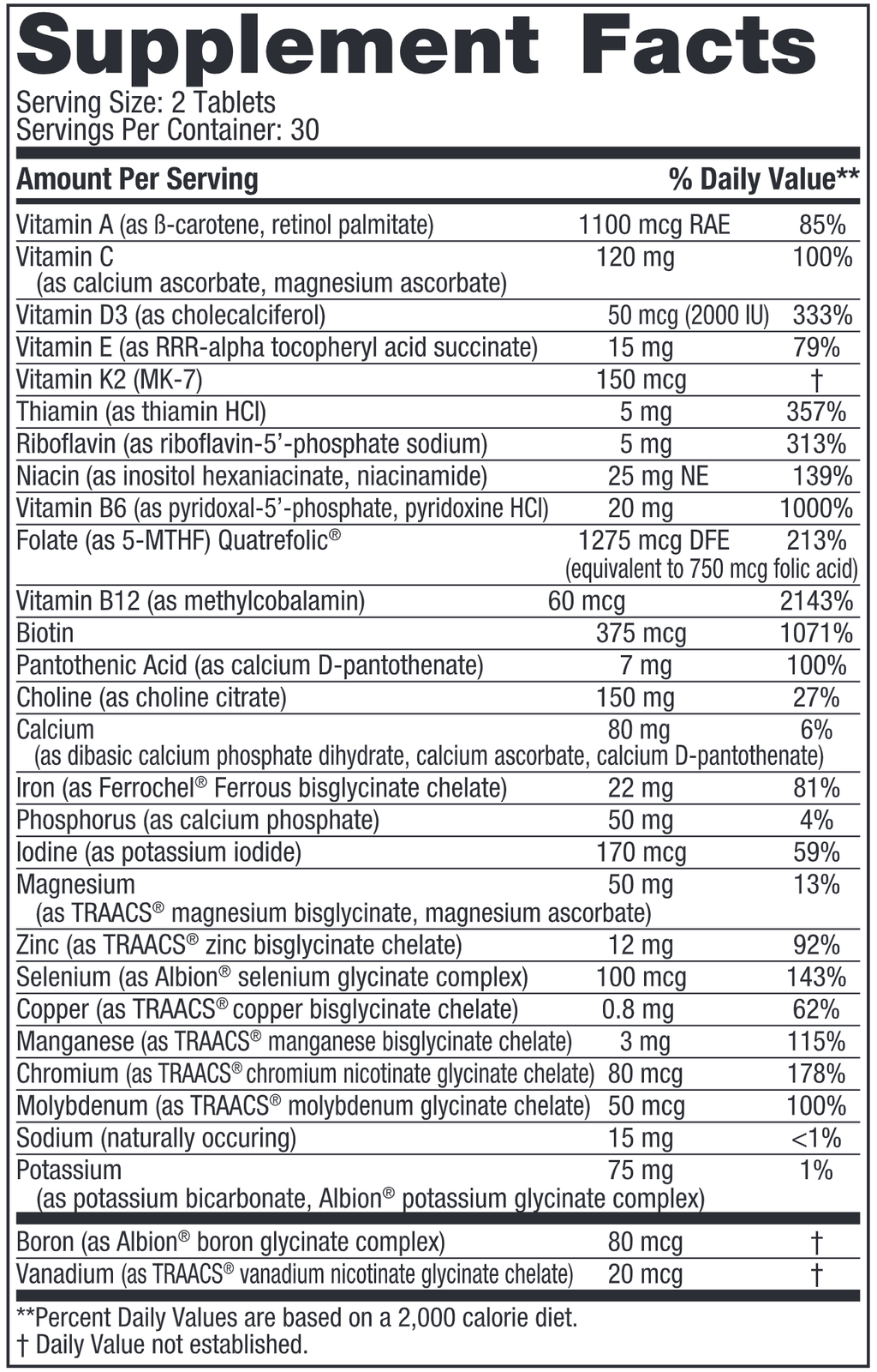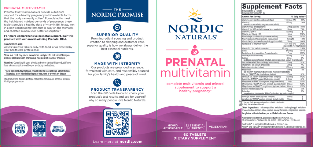 Prenatal Multivitamin tablets are formulated to meet women’s higher nutrient demands during pregnancy. They deliver a full spectrum of vitamins and minerals in highly absorbable forms, including vitamin B6, folate, iron in a non-constipating form, and chelated minerals for better absorption by the body.* This product can be paired with our award-winning Prenatal DHA for more comprehensive prenatal support.