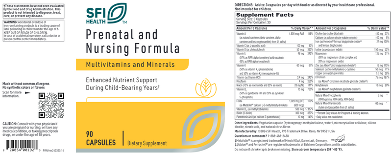 Whether you're planning for a pregnancy, pregnant, or breastfeeding, women have special nutrient needs during the childbearing years. Prenatal and Nursing Formula provides a full complement of essential vitamins and minerals in a form that is easily digested, absorbed, and used by your body. Recommended amounts of active folate (as Metafolin®‡ L-5-MTHF) and active vitamin B12 (as methylcobalamin) are included to support optimal folate metabolisms and methylation.† Prenatal and Nursing Formula also contains chelates such as Ferrochel® chelated iron – a bioavailable, non-constipating form of iron.† Vitamin D (50 mcg or 2,000 IU) to meet increased needs for fetal growth and bone development.†