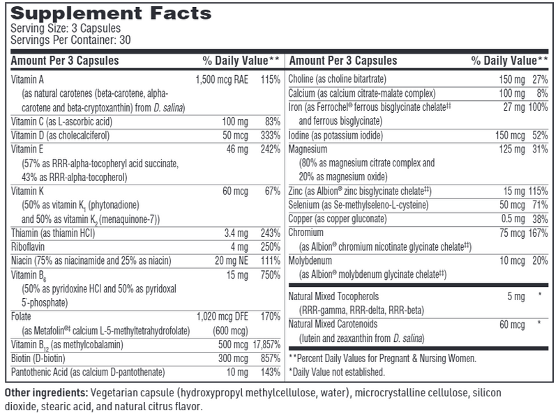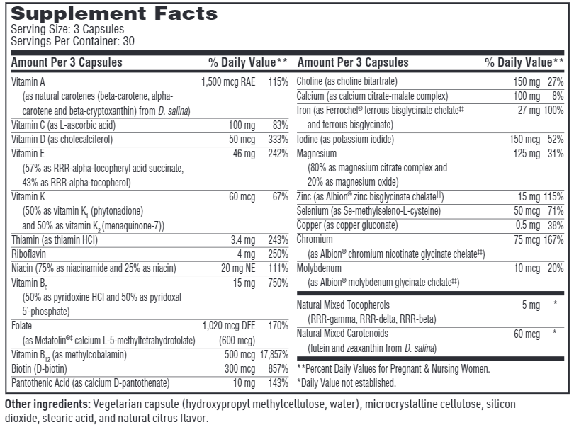 A complete, easily absorbed multivitamin and mineral supplement to support women from preconception through pregnancy and nursing.†