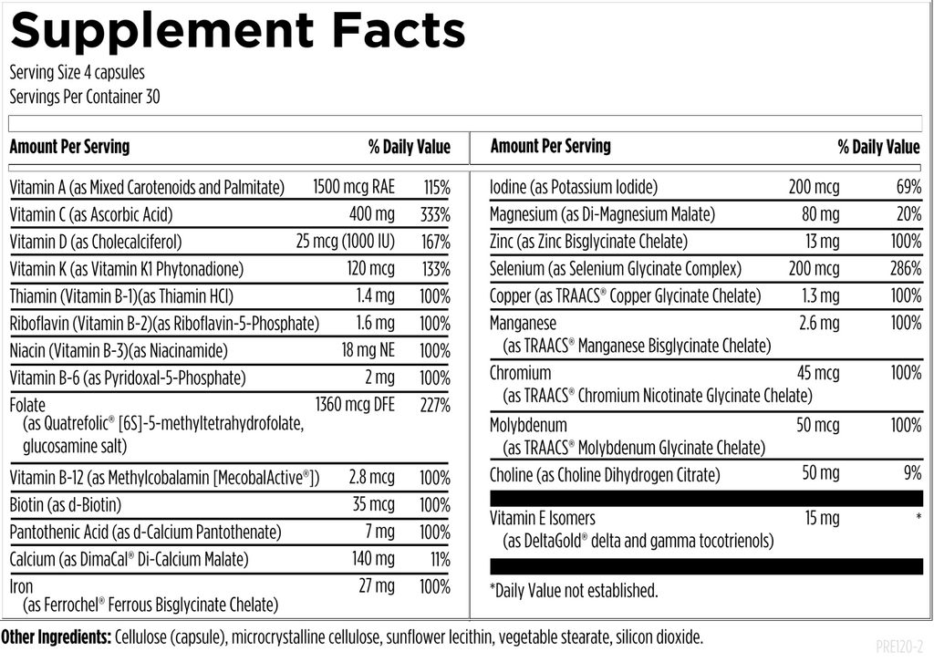 Prenatal Pro™ provides optimal supplementation for pregnant women, lactating women, and women wishing to become pregnant. The earlier that supplementation begins, the better, because women need adequate nutrient stores to meet the greater nutrient demands for a growing baby. This prenatal multivitamin provides folate in the bioidentical, bioactive form, 5-methyltetrahydrofolate (L-5MTHF) in place of synthetic folic acid. L-5MTHF is the active circulating form of folate found in the body and one of the several forms found in food.