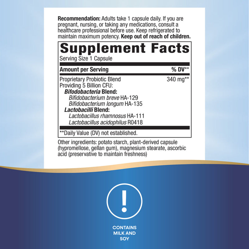 Probiotic capsules for adults with 5 billion CFUs per capsule & 4 strains of bacteria.