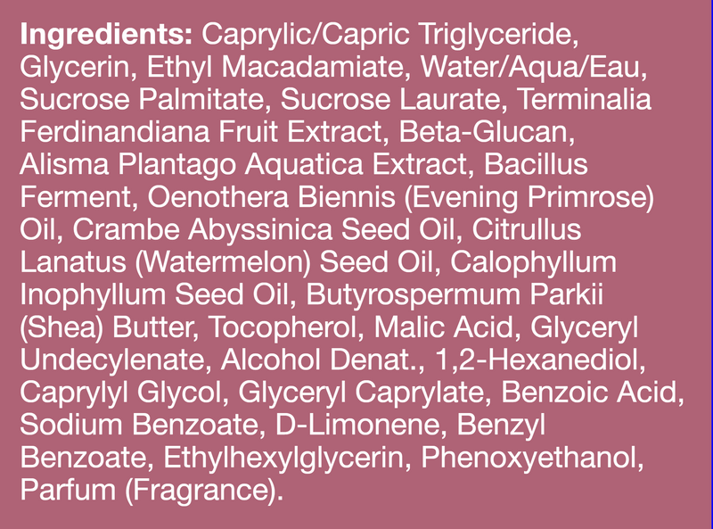 Ingredients: Caprylic/Capric Triglyceride, Glycerin, Ethyl Macadamiate, Water/Aqua/Eau, Sucrose Palmitate, Sucrose Laurate, Terminalia Ferdinandiana Fruit Extract, Beta-Glucan, Alisma Plantago Aquatica Extract, Bacillus Ferment, Oenothera Biennis (Evening Primrose) Oil, Crambe Abyssinica Seed Oil, Citrullus Lanatus (Watermelon) Seed Oil, Calophyllum Inophyllum Seed Oil, Butyrospermum Parkii (Shea) Butter, Tocopherol, Malic Acid, Glyceryl Undecylenate, Alcohol Denat., 1,2-Hexanediol, Caprylyl Glycol, Glyceryl Caprylate, Benzoic Acid, Sodium Benzoate, D-Limonene, Benzyl Benzoate, Ethylhexylglycerin, Phenoxyethanol, Parfum (Fragrance).