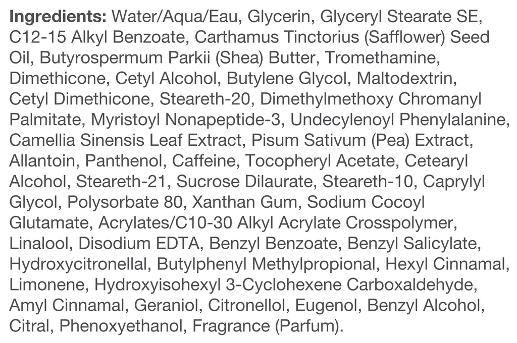 Ingredients: Water/Aqua/Eau, Glycerin,Glyceryl Stearate SE, C 12-15 Alkyl Benzoate, Carthamus Tinctorius (Safflower) Seed Oil, Butyrospermum Parkii (Shea Butter), Dimethicone, Cetyl Alcohol, Butylene Glycol, Sucrose Dilaurate 1%, Polysorbate 20, Pisumsativum (Pea) Extract, Cetearyl Alcohol, Ceteareth-20, Myristoyl Nonapeptide-3, Acrylates/C10-30 Alkyl, Acrylate Crosspolymer, Xanthan Gum, Lactobacillus/Saccharomyces/Rice/Sucrose Ferment Filtrate, Allantoin, Polysorbate 80, Camellia Sinensis Leaf Extract, Caffeine, Undecylenoyl Phenylalanine, Dimethylmethoxy Chromanyl Palmitate, Tocopheryl Acetate, Steareth-21, Steareth-20, Cetyl Dimethicone, Fragrance, Panthenol, Phenoxyethanol, Caprylyl Glycol, Disodium EDTA, Tromethamine.