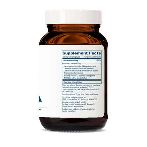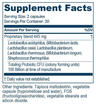 PROBIOTIC 100B™ offers a combination of seven different strains of healthy bacteria of human origin to support a healthy immune system. These cultures are manufactured through a fermentation process and then freeze-dried and blended with fructooligosaccharides (FOS). Shelf-stastable for two years at room temperature, the nitrogen-packed capsules guarantee longer life and maintain their stability for years if refrigerated. Probiotic 100B contains the following live strains: L. acidophilus 50%; L. casei 10%; L. plantarum 10%; L. rhamnosus 10%; B. lactis 10%; B. longum 5%; and S. thermophilus 5%.