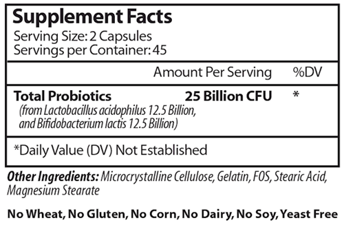 No Wheat, No Gluten, No Corn, No Dairy, No Soy, Yeast Free Must keep refrigerated: Total viable culture at the time of manufacturing is between 28 and 30 Billion CFU/Gram. Label claim of 25 Billion is what the user can expect to receive by the last dose if refrigerated. KEEP OUT OF REACH OF CHILDREN Tamper resistant. Do not purchase if seal is broken. Store in a cool, dry place.