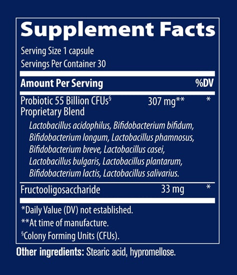**TMR guarantees probiotic potency of 55 billion CFUs‡ per capsule at time of manufacture. For best results, keep product refrigerated to maintain probiotic potency.
