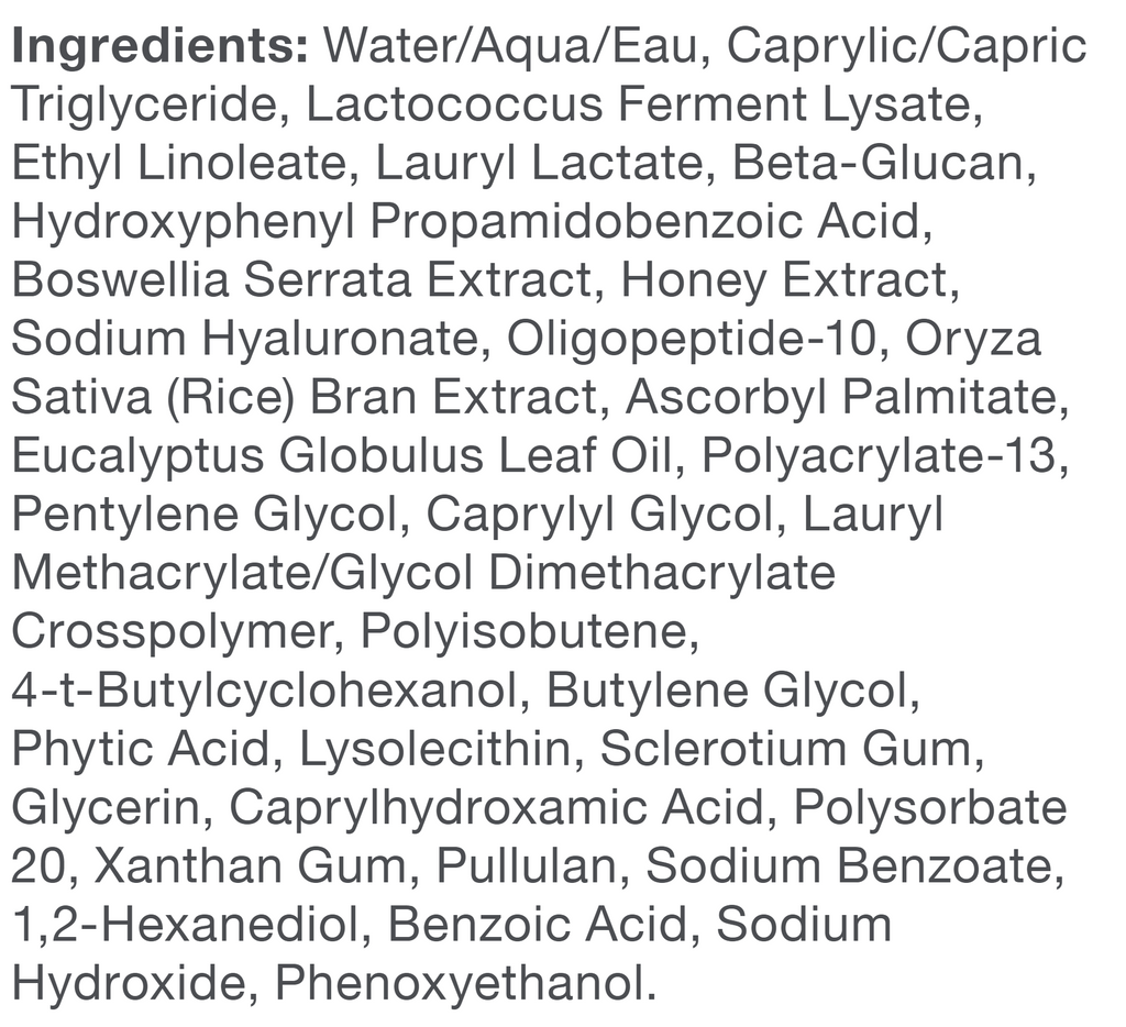 Ingredients: Water/Aqua/Eau, Caprylic/Capric Triglyceride, Lactococcus Ferment Lysate, Ethyl Linoleate, Lauryl Lactate, Beta-Glucan, Hydroxyphenyl Propamidobenzoic Acid, Boswellia Serrata Extract, Honey Extract, Sodium Hyaluronate, Oligopeptide-10, Oryza Sativa (Rice) Bran Extract, Ascorbyl Palmitate, Eucalyptus Globulus Leaf Oil, Polyacrylate-13, Pentylene Glycol, Caprylyl Glycol, Lauryl Methacrylate/Glycol Dimethacrylate Crosspolymer, Polyisobutene, 4-t-Butylcyclohexanol, Butylene Glycol, Phytic Acid, Lysolecithin, Sclerotium Gum, Glycerin, Caprylhydroxamic Acid, Polysorbate 20, Xanthan Gum, Pullulan, Sodium Benzoate, 1,2-Hexanediol, Benzoic Acid, Sodium Hydroxide, Phenoxyethanol.