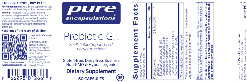 Probiotic G.I. is a shelf-stable probiotic blend to support healthy immune function within the G.I. tract. Probiotic G.I. promotes gut associated lymphoid tissue composition and function to support healthy barrier function.