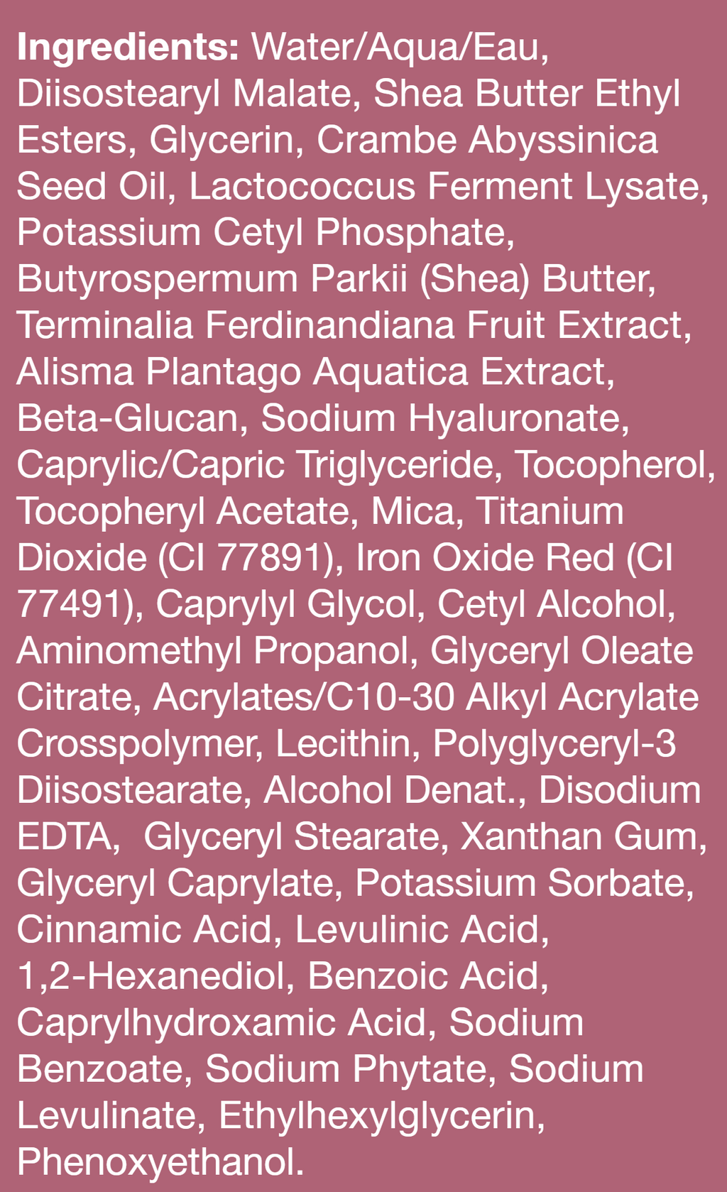 Ingredients: Water/Aqua/Eau, Diisostearyl Malate, Shea Butter Ethyl Esters, Glycerin, Crambe Abyssinica Seed Oil, Lactococcus Ferment Lysate, Potassium Cetyl Phosphate, Butyrospermum Parkii (Shea) Butter, Terminalia Ferdinandiana Fruit Extract, Alisma Plantago Aquatica Extract, Beta-Glucan, Sodium Hyaluronate, Caprylic/Capric Triglyceride, Tocopherol, Tocopheryl Acetate, Mica, Titanium Dioxide (CI 77891), Iron Oxide Red (CI 77491), Caprylyl Glycol, Cetyl Alcohol, Aminomethyl Propanol, Glyceryl Oleate Citrate, Acrylates/C10-30 Alkyl Acrylate Crosspolymer, Lecithin, Polyglyceryl-3 Diisostearate, Alcohol Denat., Disodium EDTA, Glyceryl Stearate, Xanthan Gum, Glyceryl Caprylate, Potassium Sorbate, Cinnamic Acid, Levulinic Acid, 1,2-Hexanediol, Benzoic Acid, Caprylhydroxamic Acid, Sodium Benzoate, Sodium Phytate, Sodium Levulinate, Ethylhexylglycerin, Phenoxyethanol.