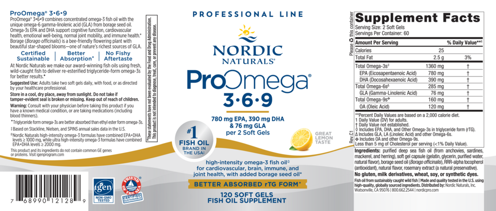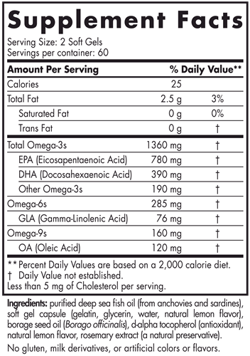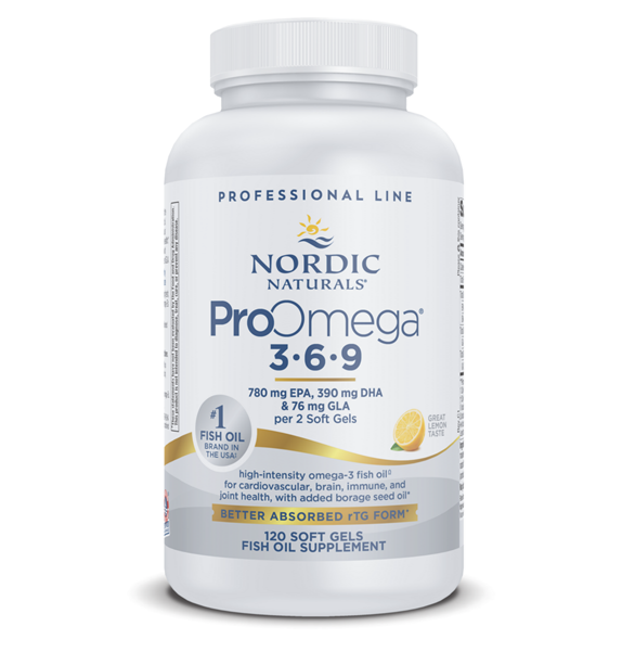 ProOmega®-3⋅6⋅9 combines concentrated omega-3s EPA and DHA from fish oil with GLA from borage oil and omega-9 to provide high-intensity, full-spectrum fatty acid support for optimal skin, cardiovascular, eye, neurological, joint, and immune health.*