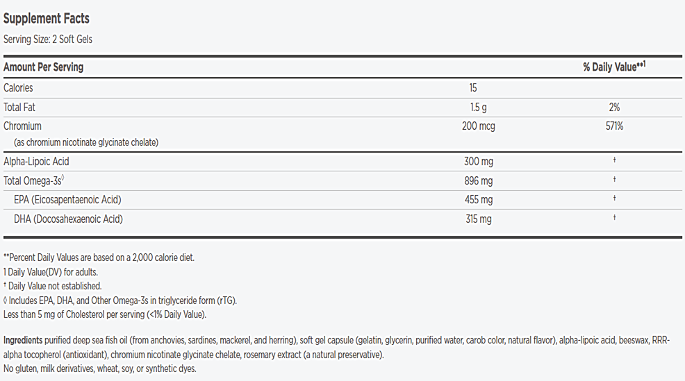 This synergistic formula combines concentrated omega-3s EPA and DHA with two other important nutrients that play key roles in maintaining insulin action and glucose balance in one targeted formula.*
