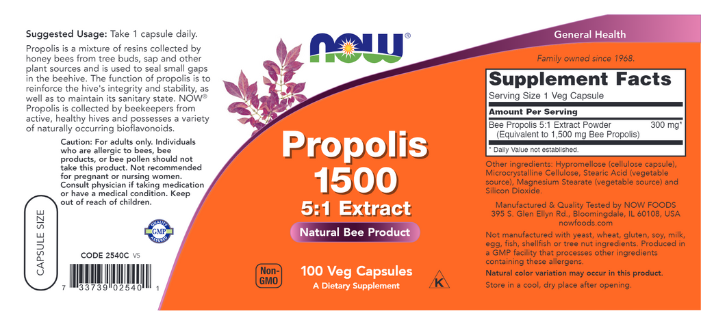 Propolis is a mixture of resins collected by honey bees from tree buds, sap and other plant sources and is used to seal small gaps in the beehive. The function of propolis is to reinforce the hive's integrity and stability, as well as to maintain its sanitary state. NOW® Propolis is collected by beekeepers from active, healthy hives and possesses a variety of naturally occurring bioflavonoids.