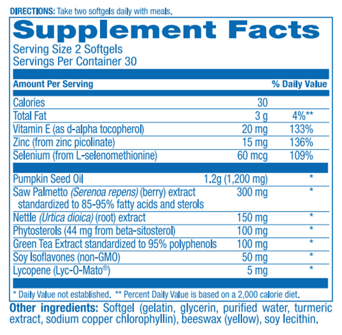 Features saw palmetto and pumpkin seed oil with a combination of vitamin-mineral-botanicals complex, which is shown to be effective in stabilizing prostate volume and significantly reducing the symptoms of lower urinary tract problems.