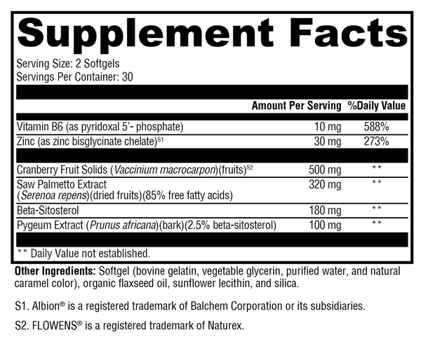 Prostate FLO™ supports normal male lower urinary tract function and prostate health. Clinically meaningful levels of key ingredients target urinary flow and frequency as well as prostate-related hormone metabolism. This formula features FLOWENS®—a full-spectrum cranberry powder optimized for men’s health—combined with beta-sitosterol, pyridoxal 5’-phosphate, TRAACS® zinc bisglycinate chelate, and highly concentrated, standardized extracts of saw palmetto and pygeum.*